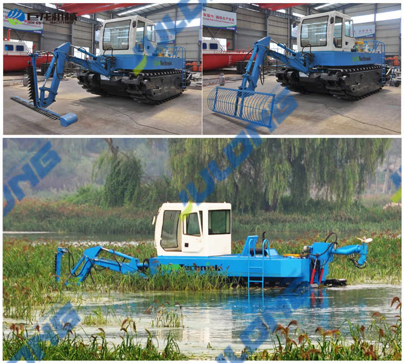 巨龍兩棲式多功能船采用浮箱履帶式設計,既可以在陸地上行走,又能在水上工作,其配備有挖斗、割刀、吸泥泵、收集耙、收集叉等工作單元,可以完成挖掘、收割、吸泥、排泥、清理雜草垃圾等工作。